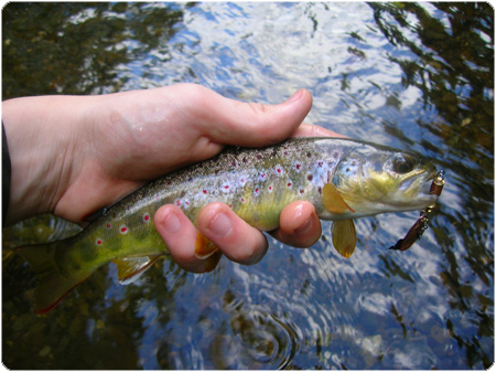 Zurück zum Angeln. Ich steh endlich im Bach. Es ist ziemlich warm. Wenigstens meine Beine sind bis zu den Oberschenkeln im kühlen Nass. Schnell habe ich Fluocarbon an die 0.09er geflochtene Hauptschnur und einen kleinen Spinner ans Ende geknüpft. Schon am ersten Gumpen geht’s gut los. 2 wunderschön gefärbte BaFos um die 20cm kann ich überlisten. Was für ein Start!