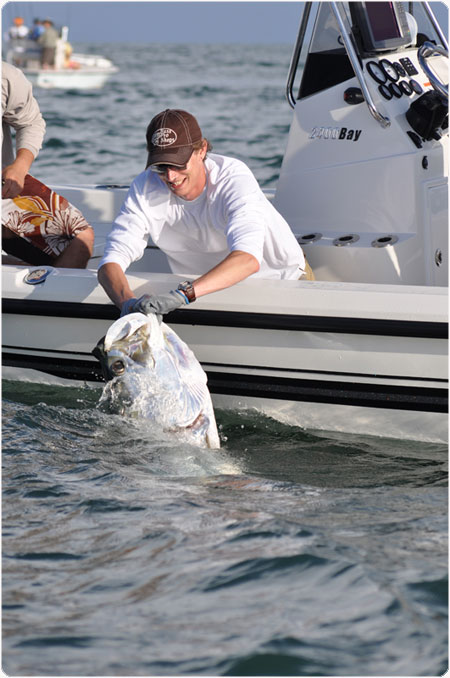 Florian war der erste unserer Gruppe, der gleich am zweiten Tag einen 100-Pfünder und einen 175-Pfünder fangen konnte. Felix, Gela und ich konnten am zweiten Tag zwar einige Fische haken, aber keinen landen. Die Aussteigerquote beim Tarponfischen ist mit 1:2,5 relativ bescheiden. Doch bereits am kommenden Tag gelang es Gela nach mehr als 40 Minuten Drill, ihren ersten Tarpon zu landen. Wir staunten nicht schlecht, als der große silberne Fisch in die Nähe des Bootes kam. Mit 180 Pfund war dieser Fisch ein weltklasse Einstieg in das Tarponfischen.