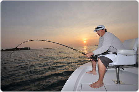 Bekanntlich zahlt sich die Ausdauer früher oder später aus. So auch bei uns. Wir fischten am letzten Tag zu dritt den Pass. Unsere letzte Chance, einen Tarpon erfolgreich zu landen. Noch im Dunkeln kamen wir an dem Lighthouse an. Ein Blick auf das Echolot stimmte uns zuversichtlich. Auf mehr als 40 Fuß Höhe stapelten sich die Tarpone im Pass. Es dauerte keine zehn Sekunden beim ersten Ablassen der Montage, da konnte Felix auch schon den ersten Fisch haken.