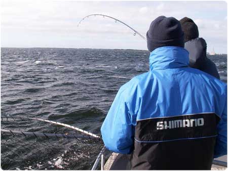 Auf Grund des starken Windes, der jedoch laut Wettervorhersage im Laufe des Tages noch nachlassen sollte, sind wir zunächst nicht weit gefahren und haben im Bereich vor Schaprode gefischt. Da ich im Gegensatz zu den anderen beiden das Grundprinzip verstanden zu haben glaubte, fischte ich gleich drauflos, während Jens den anderen Gerät, Montage, Köder und Köderführung erklärte. Es dauerte auch nicht lange, da verbuchte ich den ersten Kontakt. Leider blieb der Fisch nicht hängen, sondern begnügte sich damit, sich in meinem Gummifisch verewigt zu haben. Kurz darauf hatte Jessica dann einen Fisch an der Angel, bei dessen Anlandung sich nicht nur der Fisch in hohem Bogen spektakulär verabschiedete, sondern auch klar wurde, dass es noch Wissensbedarf zu Anhieb, Drill und Landung gab. Wir haben jedenfalls alle gelacht.