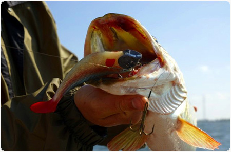 Um bei den harten Bedingungen den Köder noch halbwegs kontrolliert führen zu können sind schwere Bleiköpfe angesagt. Mit Gewichten um die 30 Gramm bestückt, werden die Gummis weiter stundenlang rausgepeitscht. Als immer noch nervend stellt sich das rumtreibende Seegras heraus. Nach jedem Wurf muss der Gummifisch und das Vorfach von einzelnen Büscheln befreit werden.