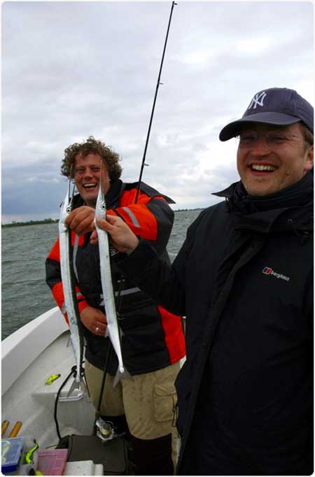 Wir nehmen diese ‚Schlappe’ sportlich und verkürzen uns gelegentlich die bissfrei Zeit mit dem einen oder anderen Hornhechtdrill. Insgesamt sind uns am Abschlusstag doch noch fünf Entenschnäbel auf den Leim gegangen.